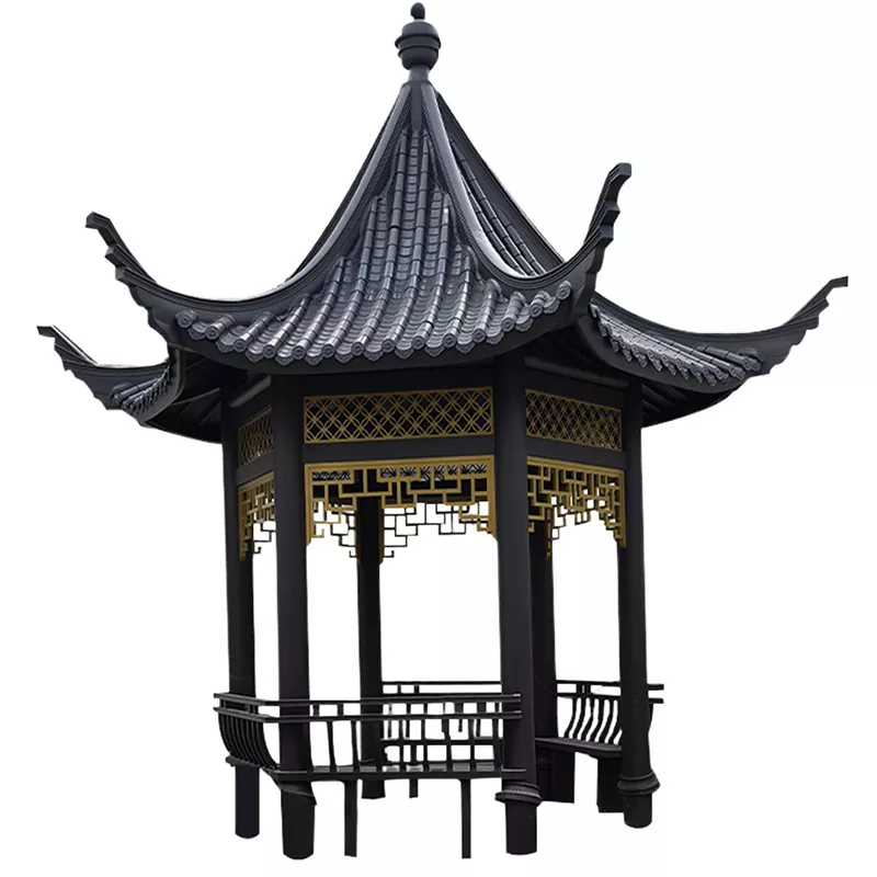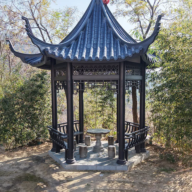 Ancient-Style Replica Pavilion (5000 × 5000 mm): 120 × 120 mm tugevdatud postid, tugev struktuur, poolläbipaistvate nikerdatud rippuvate komponentidega. Valikuliselt kasutab toru- või glasuurplaate, mis sobivad kultuuripaikadesse ja looduskaunitesse kohtadesse.